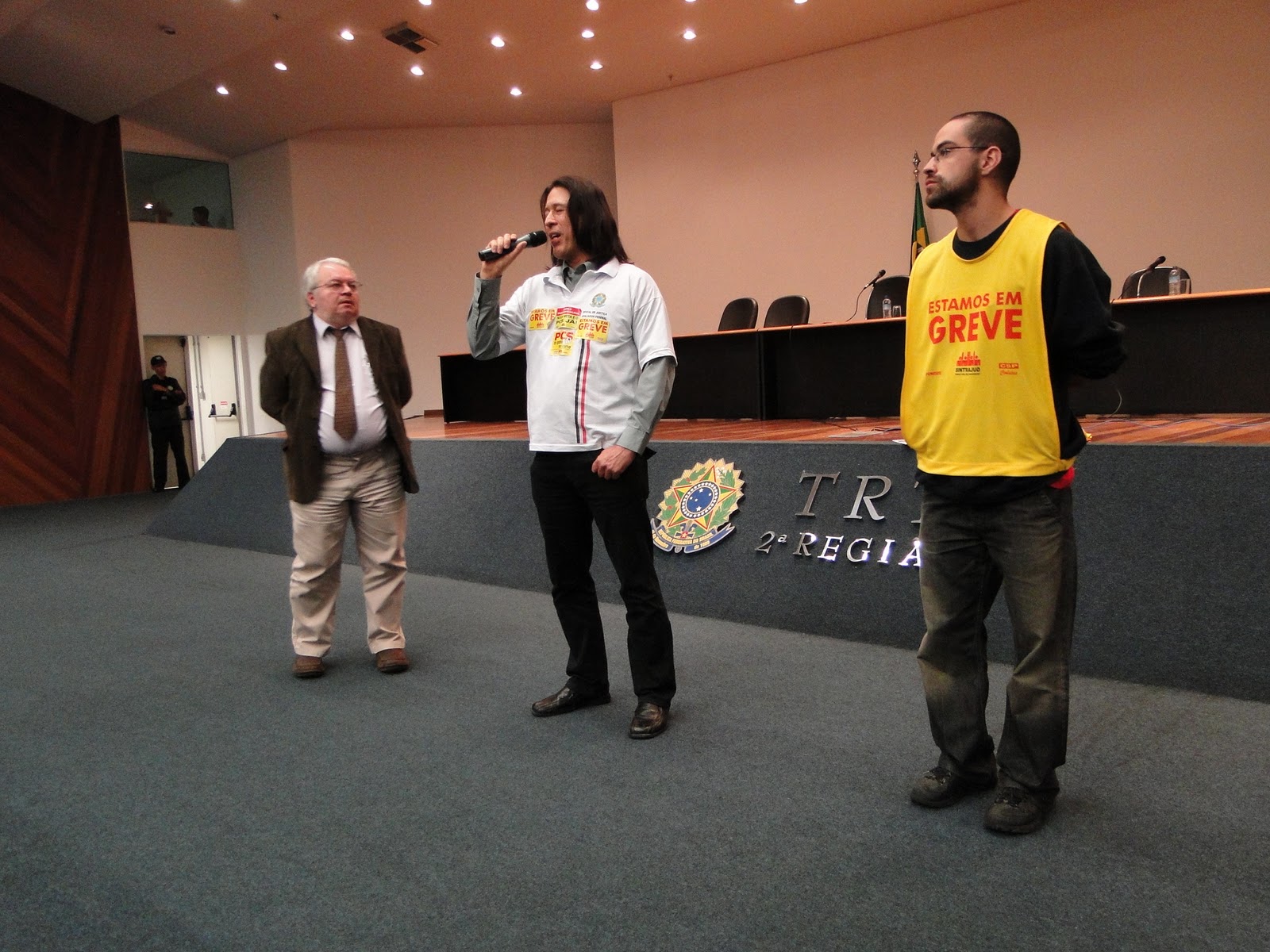 No dia 20/10/2.011, às 17:00 horas, imediatamente após encerrado o painel de palestras realizado nesta data em parceria da Ejud/2 com a Aojustra, os Oficiais de Justiça presentes, oriundos de praticamente todas as Centrais de Mandados e Varas do Trabalho da jurisdição do TRT/2 decidiram por maioria de votos aderir à greve nacional pela aprovação do PCS-4 e contra o projeto de lei do governo que institui o congelamento salarial dos funcionários públicos por 10 anos.